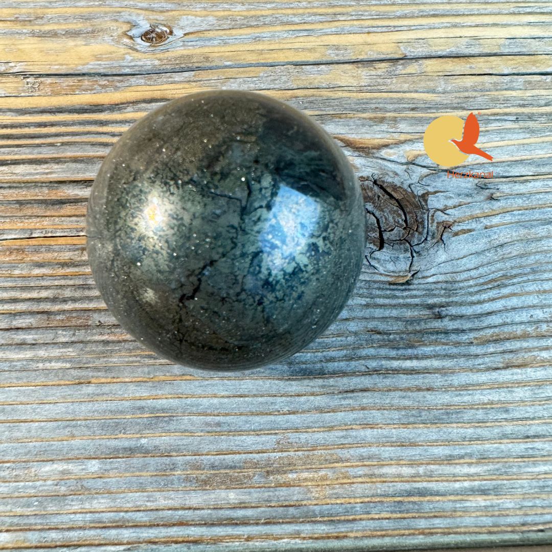 Platziere die Pyrit-Kugel auf deinem Schreibtisch oder im Arbeitsraum, um Fokus, Durchhaltevermögen und Selbstvertrauen zu stärken.